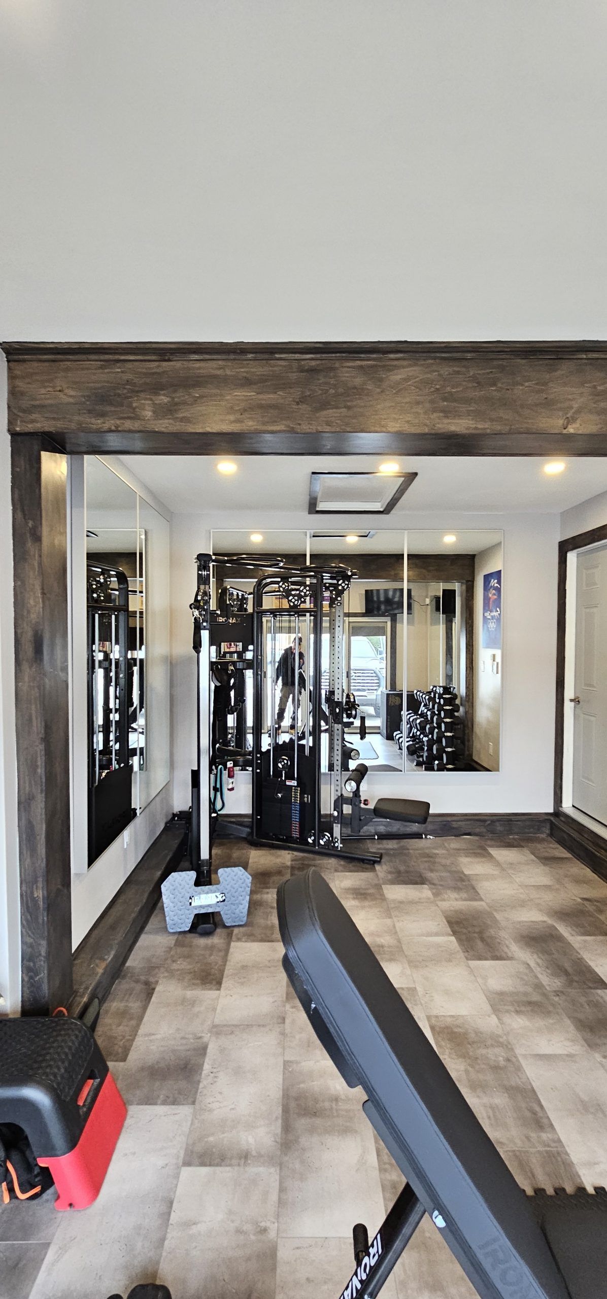 Our design team saw possibilities where the home owners didn’t, after an assessment of the exact amount of space needed to accommodate their equipment we were able to block off a portion of their existing garage and do the nearly impossible and turn a cold concrete space into a warm inviting and rather cool looking fully functional Gym.