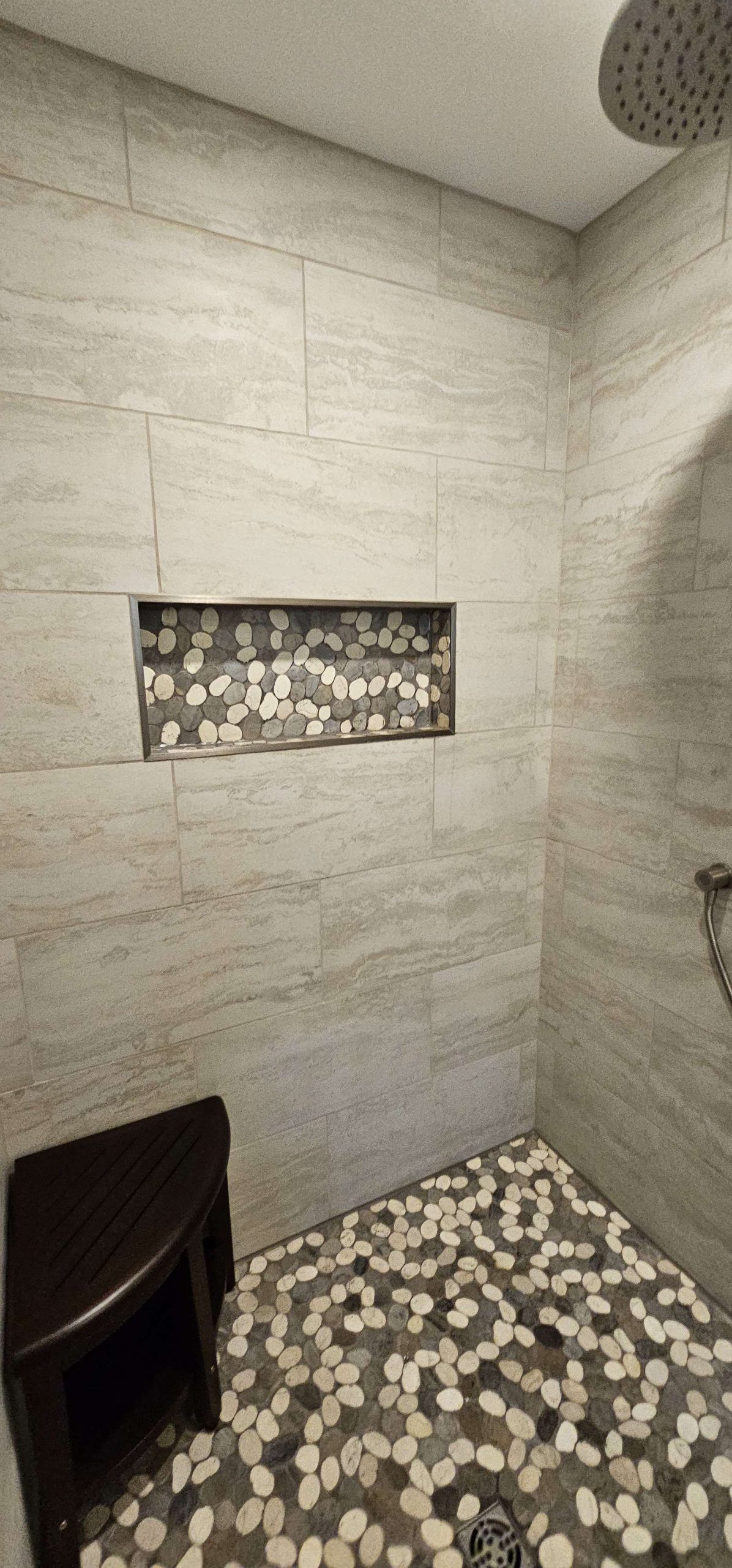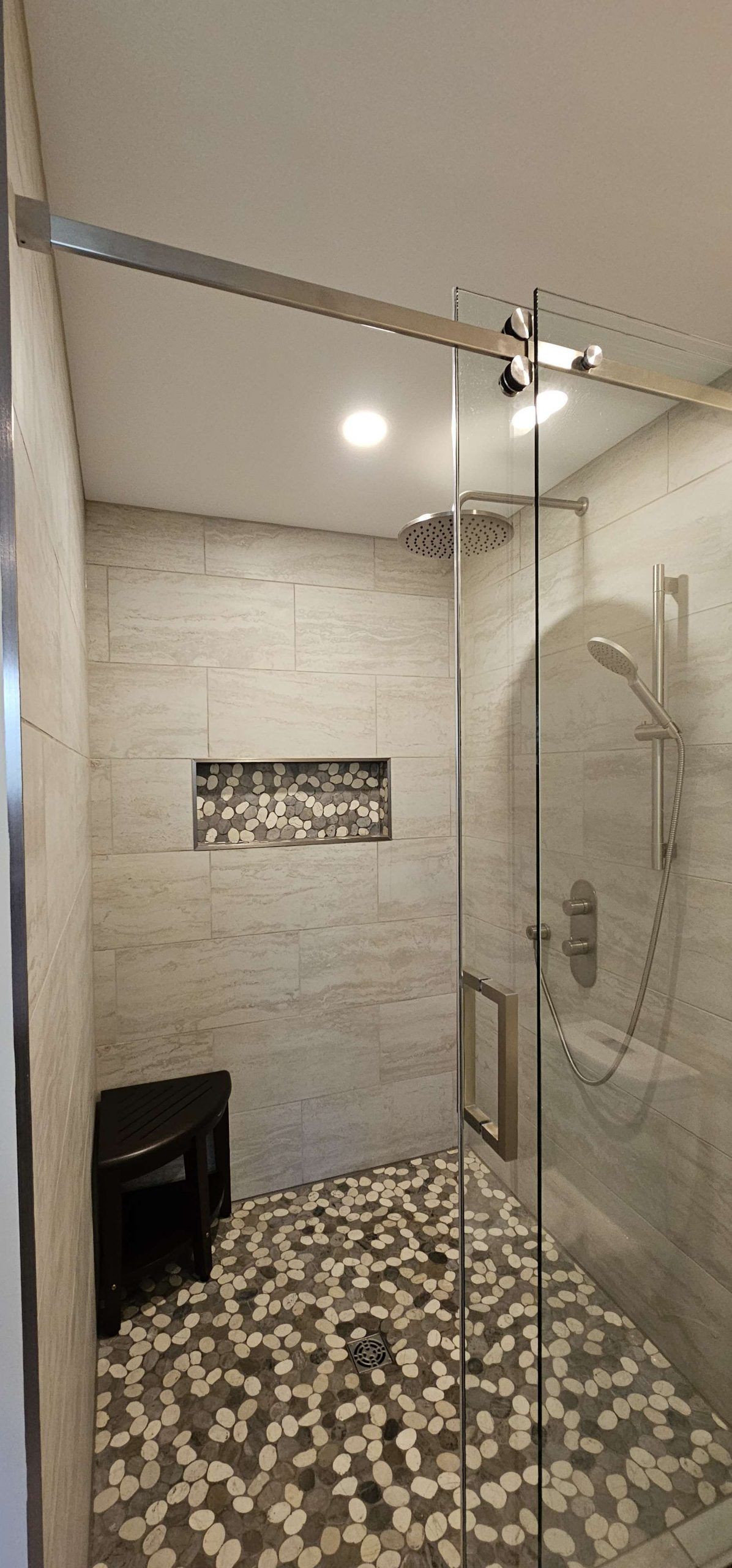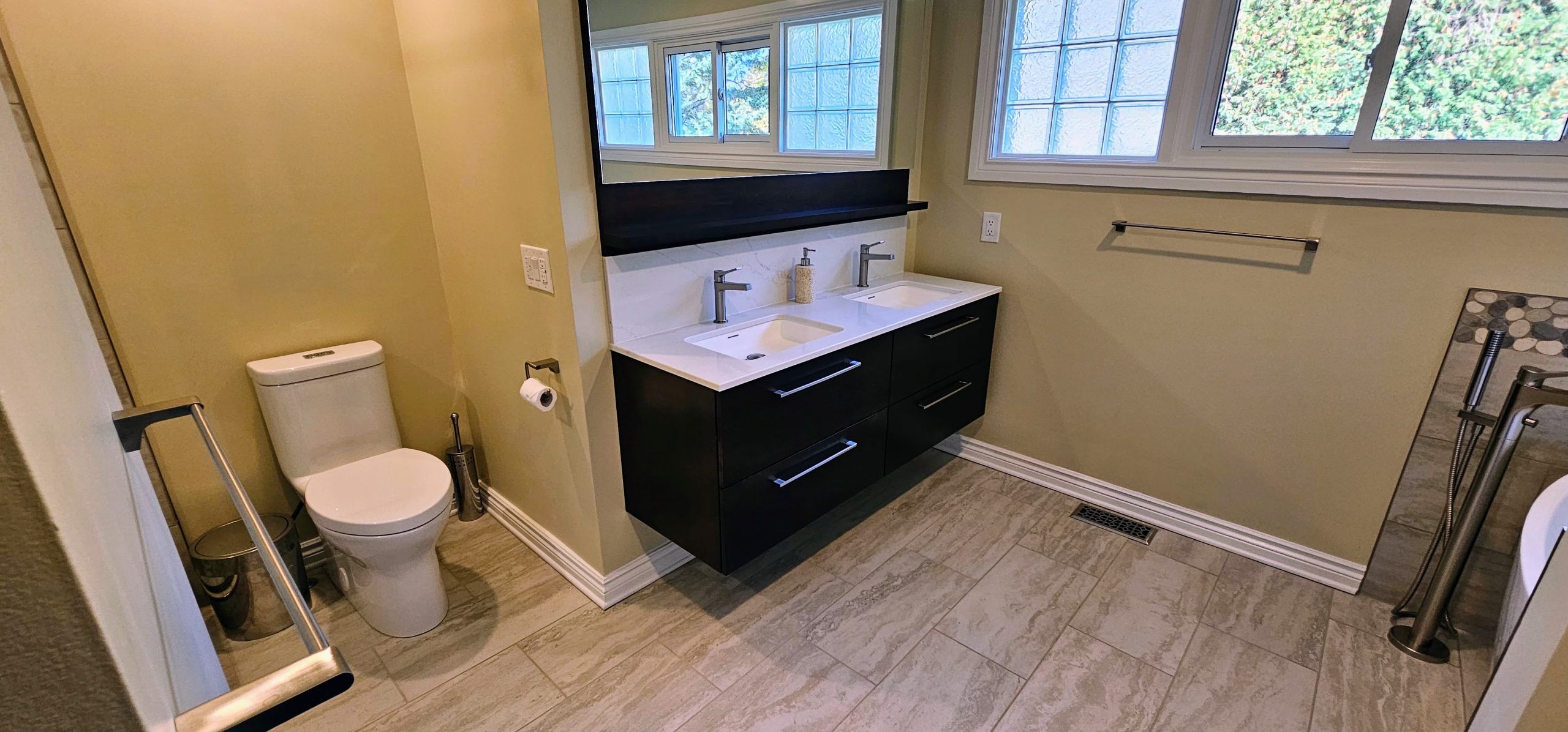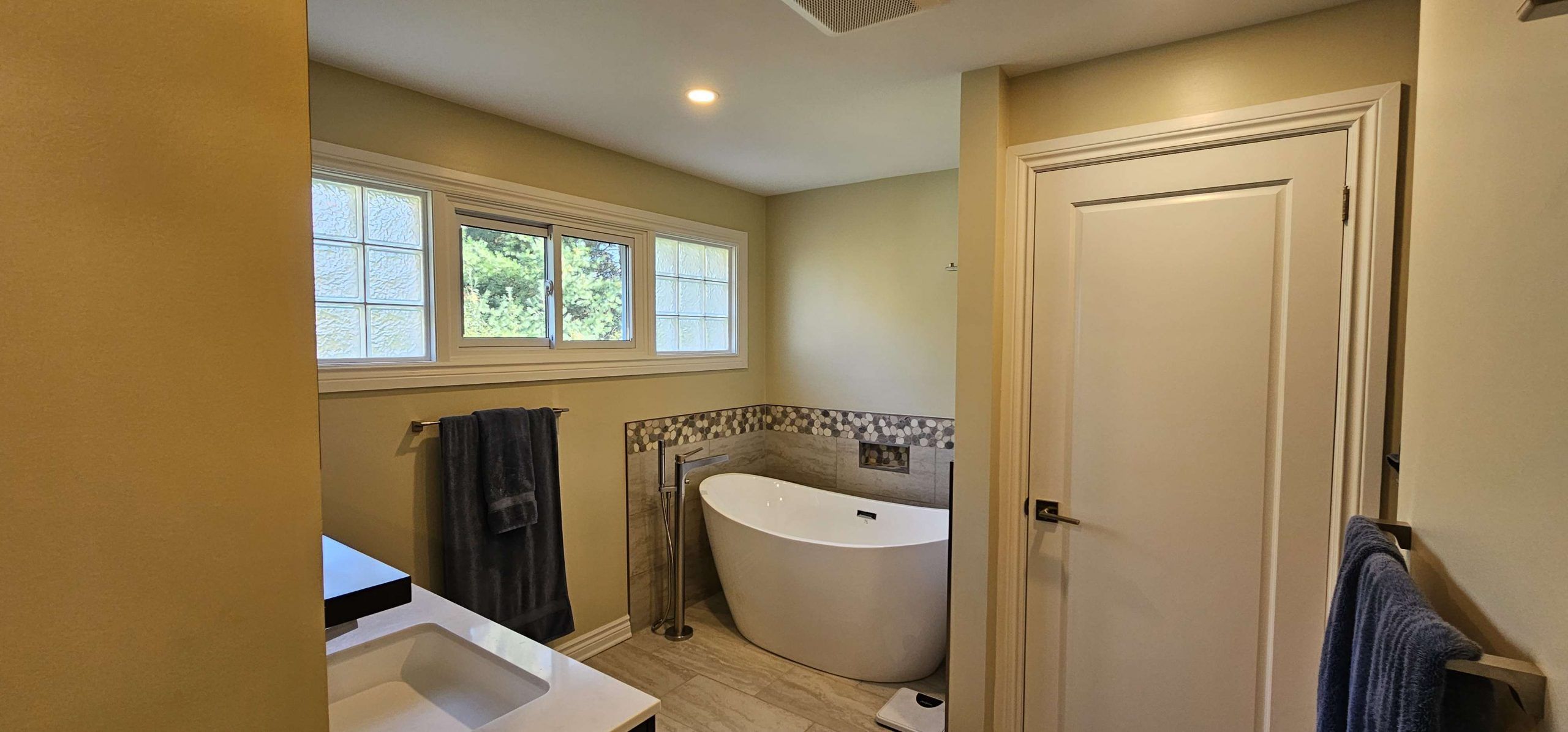 With a stunning custom washroom that brings luxury and relaxation into everyday life. Featuring a beautiful freestanding, this space invites you to unwind in style. We designed a spacious walk-in shower with premium fixtures, providing a spa-like experience right at home. High-end finishes, ample lighting, and carefully chosen details make this washroom a standout feature, blending functionality with elegance. Every element was crafted to enhance both comfort and aesthetic appeal, resulting in a washroom that truly elevates the home
