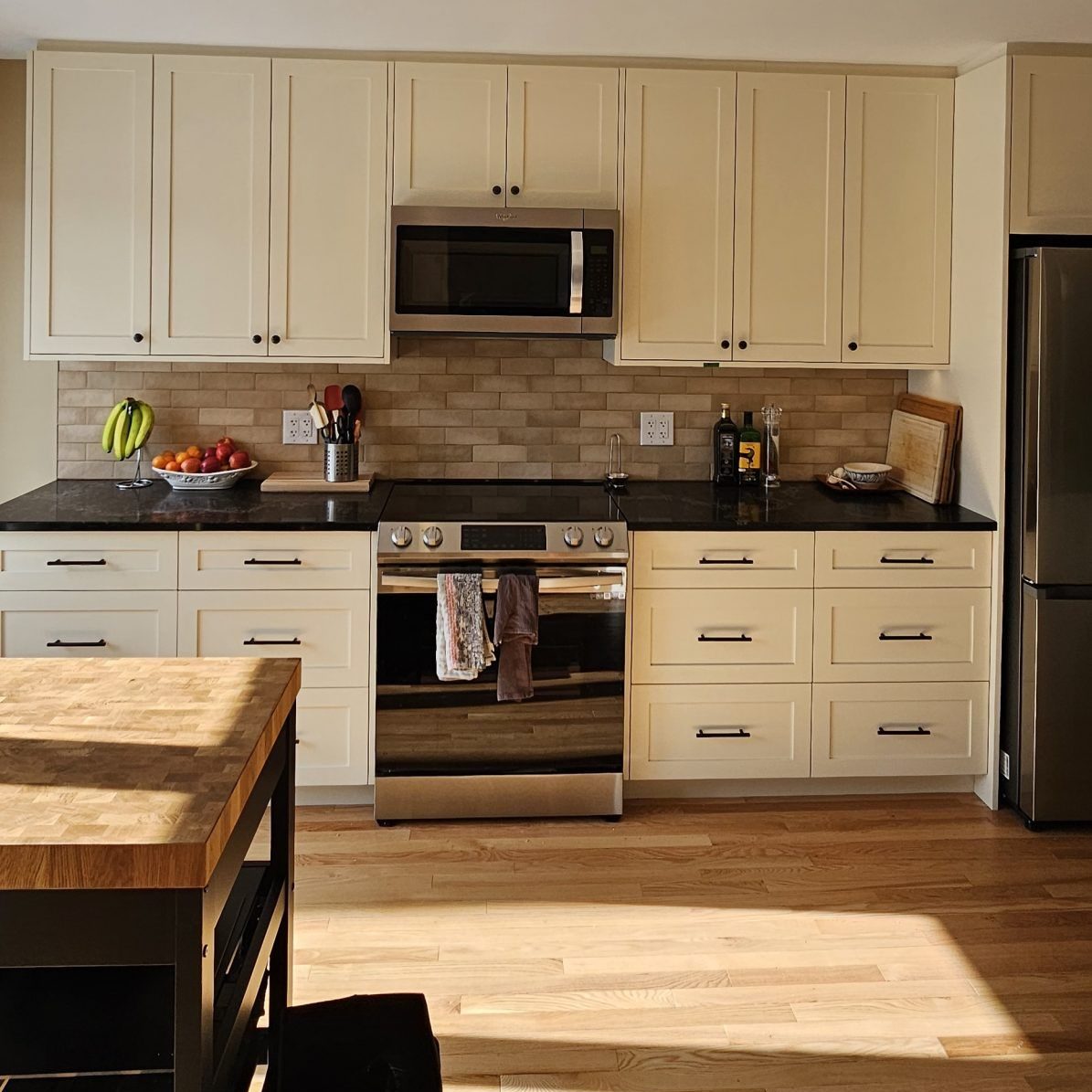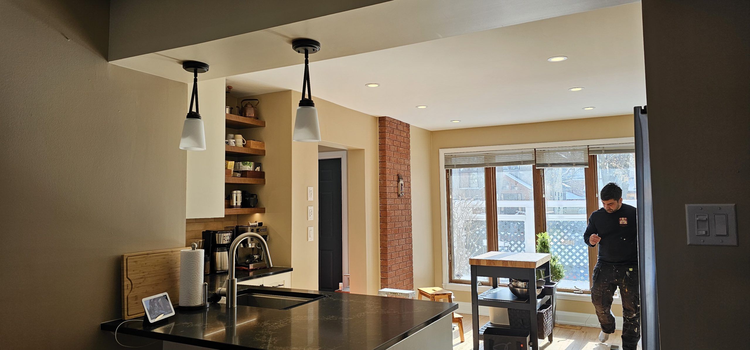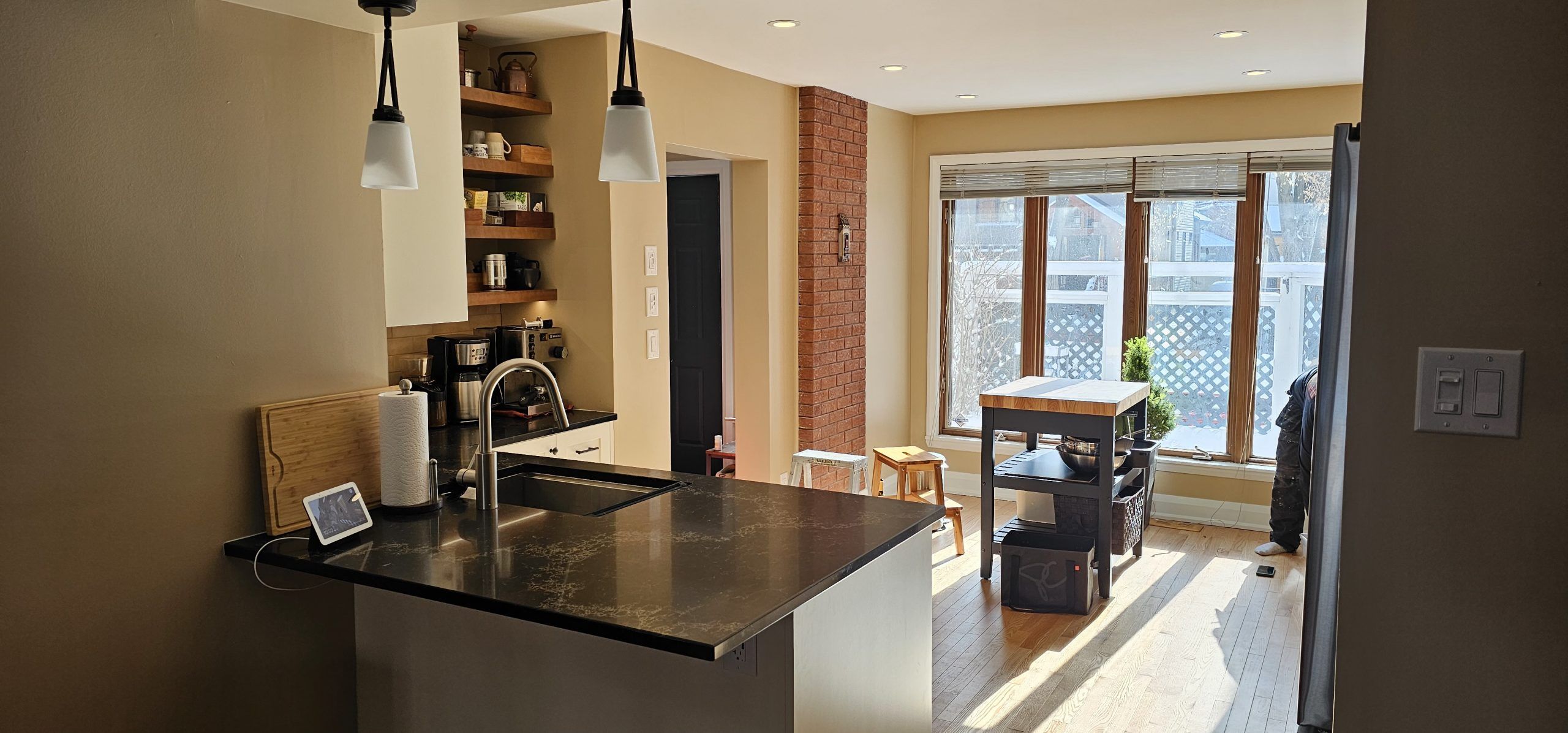 The new kitchen features sleek, modern cabinets that provide both elegance and ample storage. We complemented these with striking black granite countertops, which add a touch of sophistication and durability.Custom shelves were installed to offer additional storage while showcasing a clean, modern design.