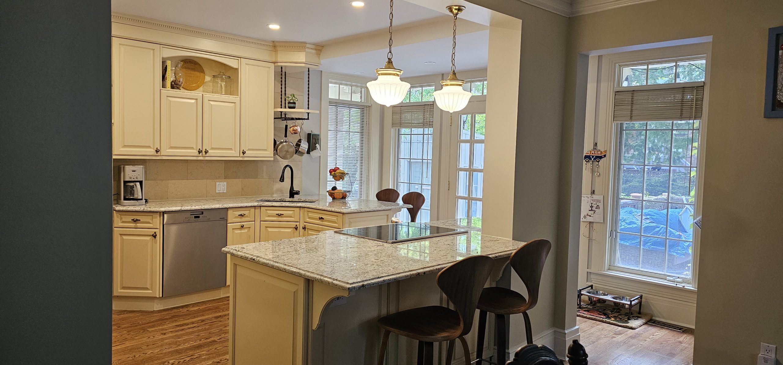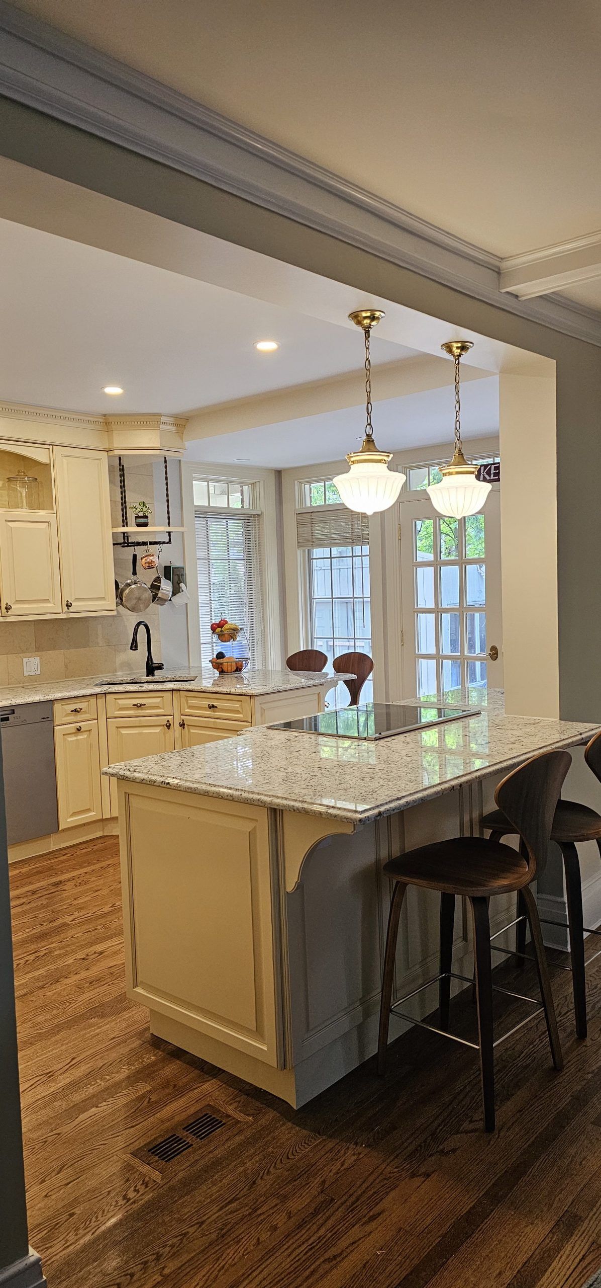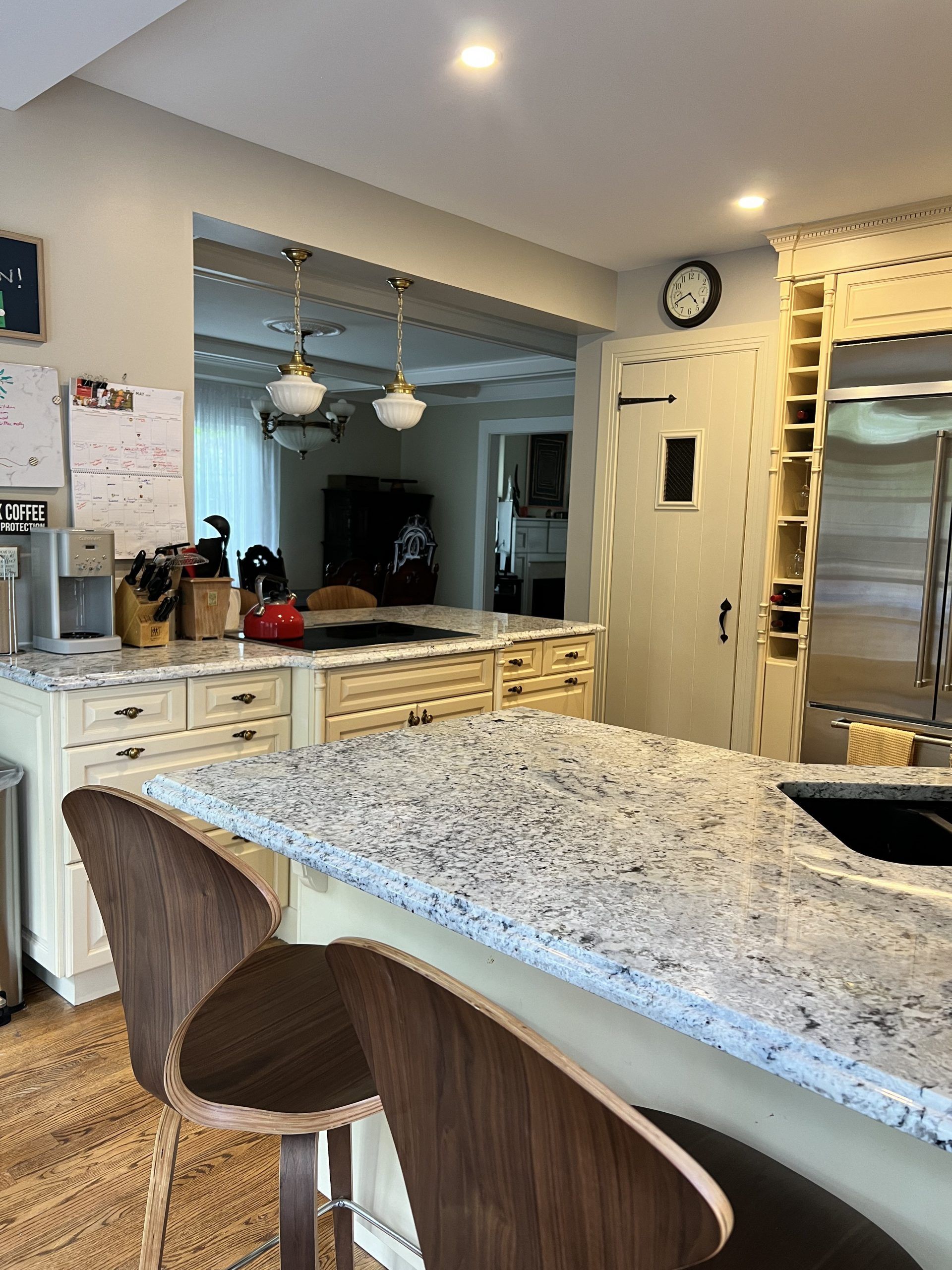 We meticulously restored the hardwood flooring, blending it across the kitchen and living room, then re-sanded and re-stained the kitchen floor to ensure a cohesive look. To elevate both style and function, we added custom white ice granite countertops with overhangs on two sides, perfect for bar seating and casual dining.