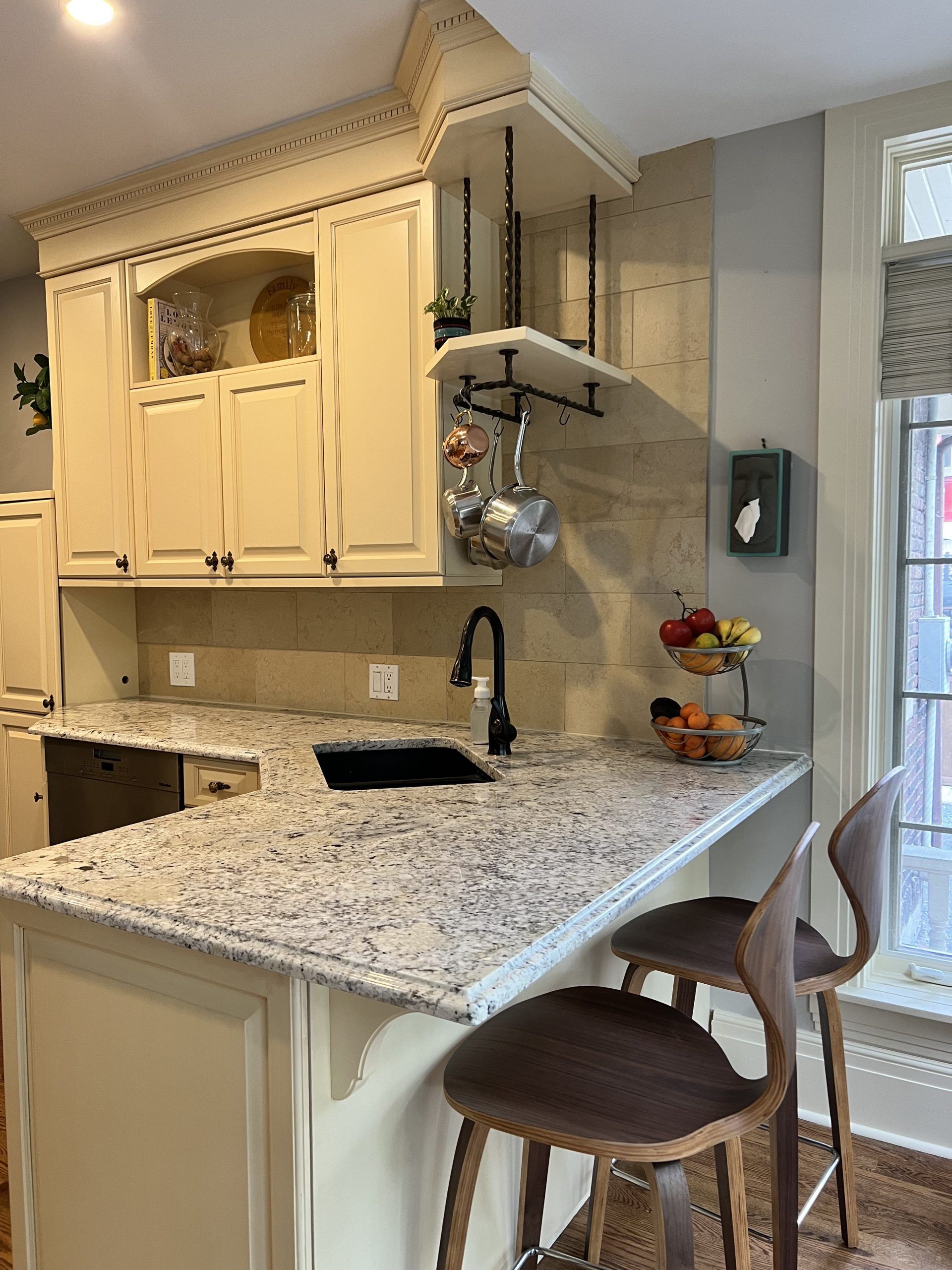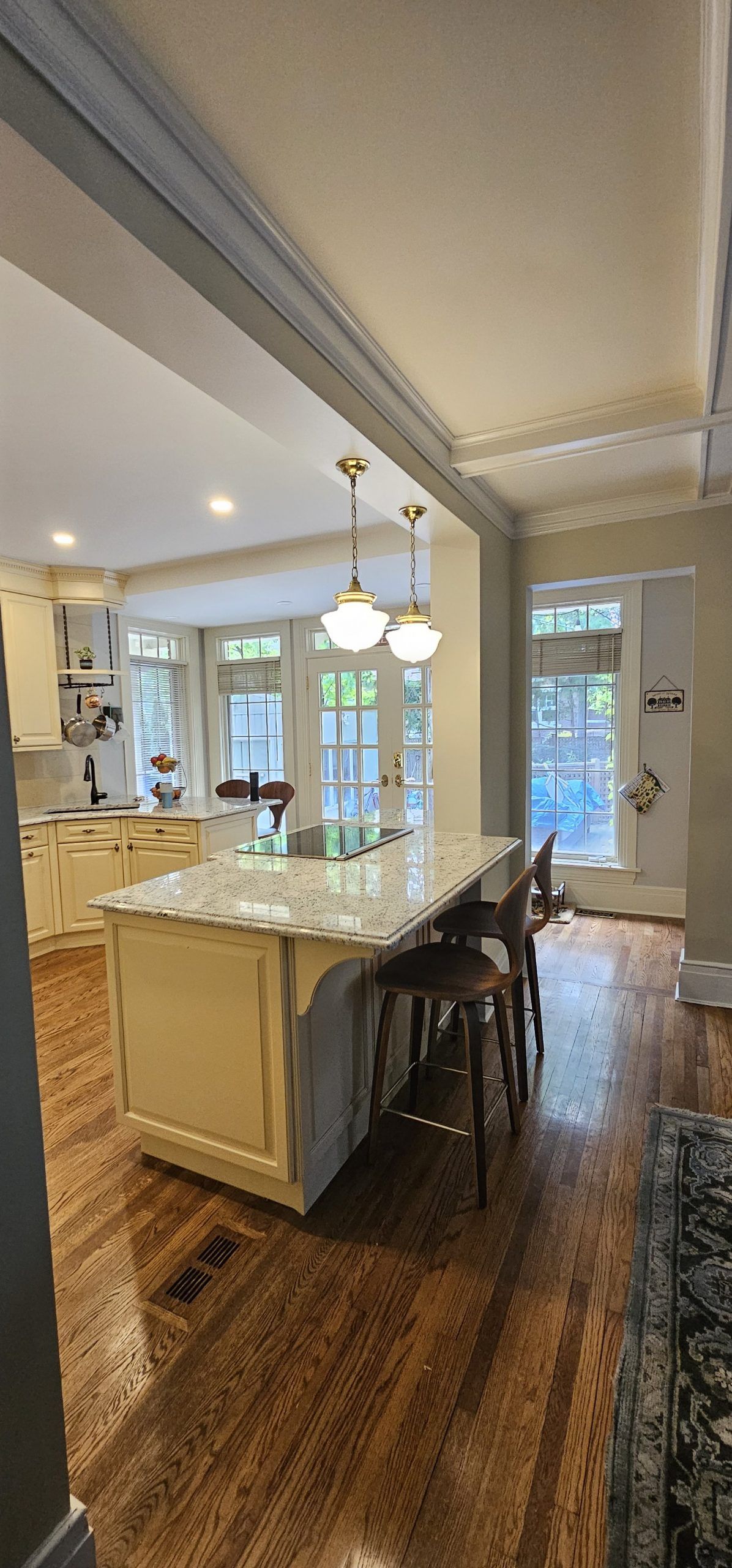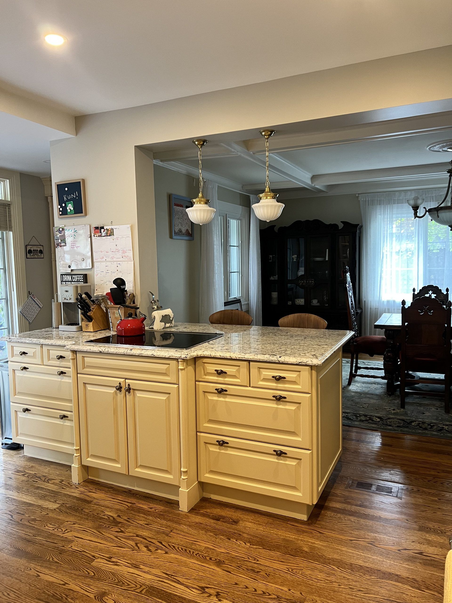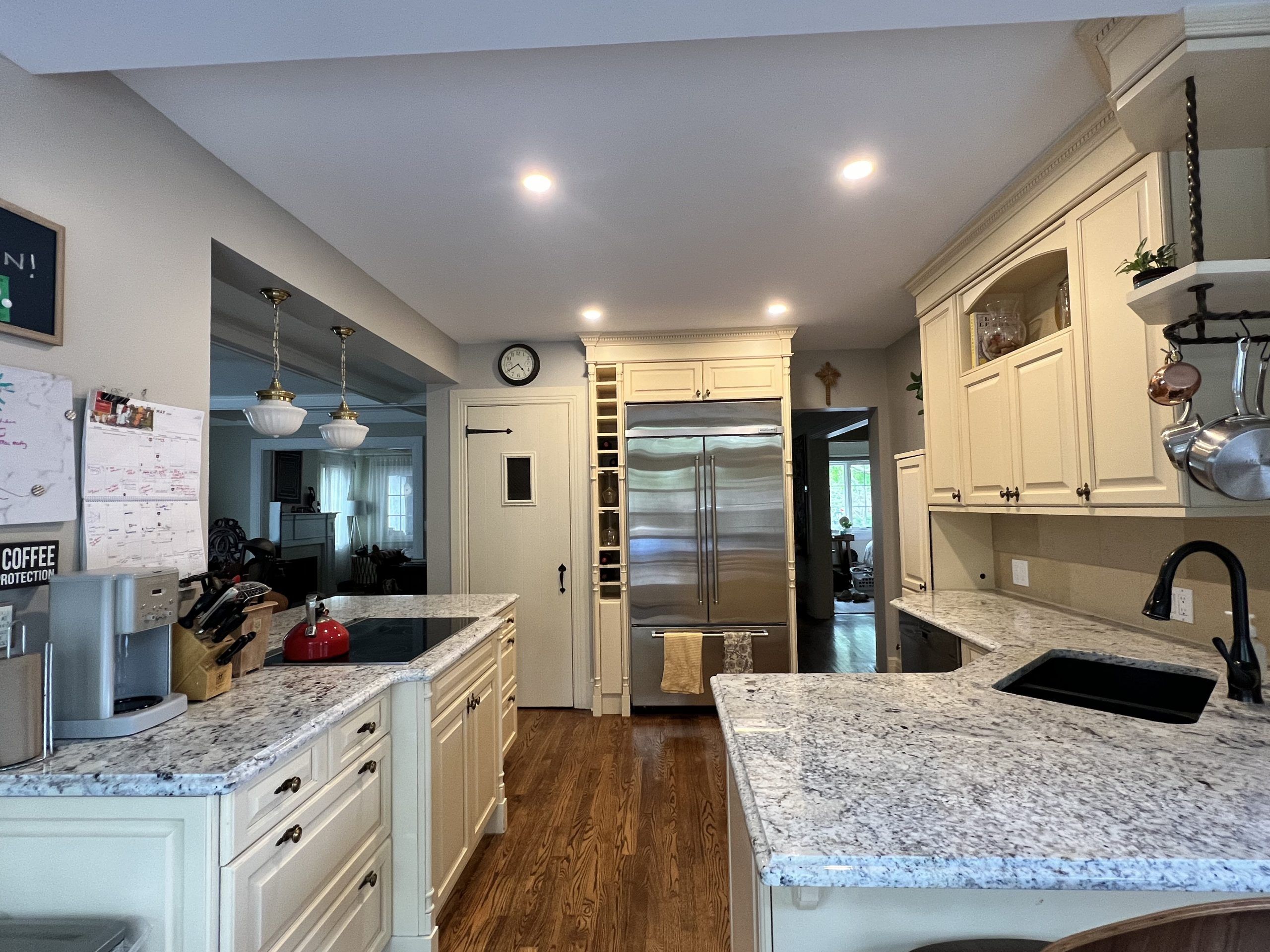 We meticulously restored the hardwood flooring, blending it across the kitchen and living room, then re-sanded and re-stained the kitchen floor to ensure a cohesive look. To elevate both style and function, we added custom white ice granite countertops with overhangs on two sides, perfect for bar seating and casual dining.