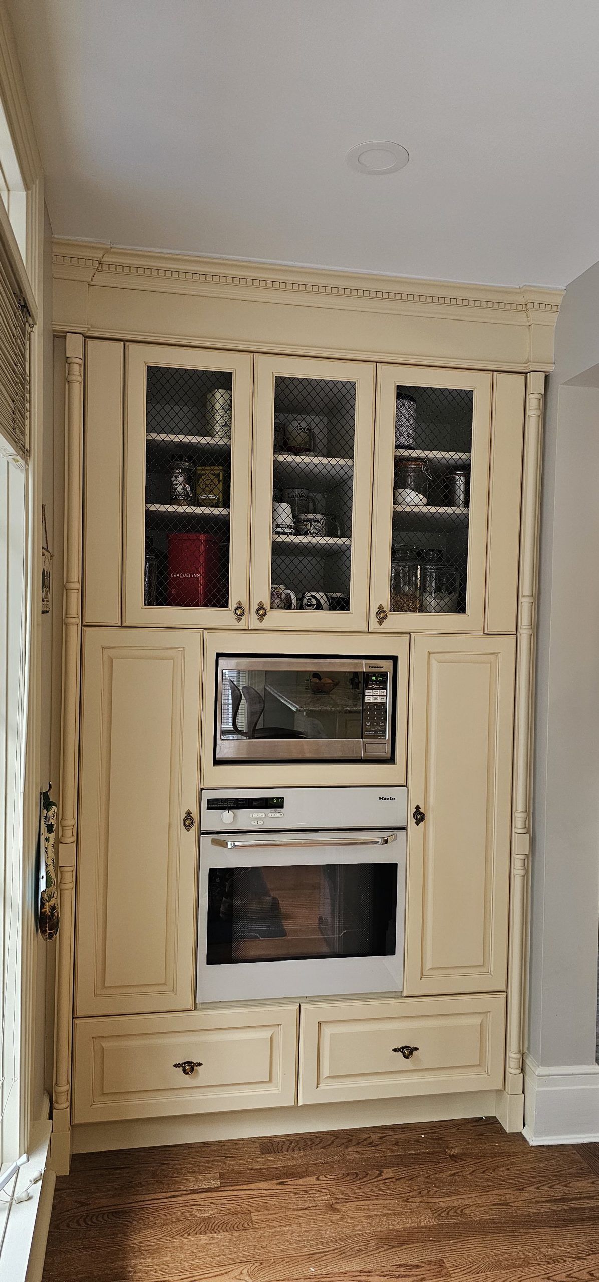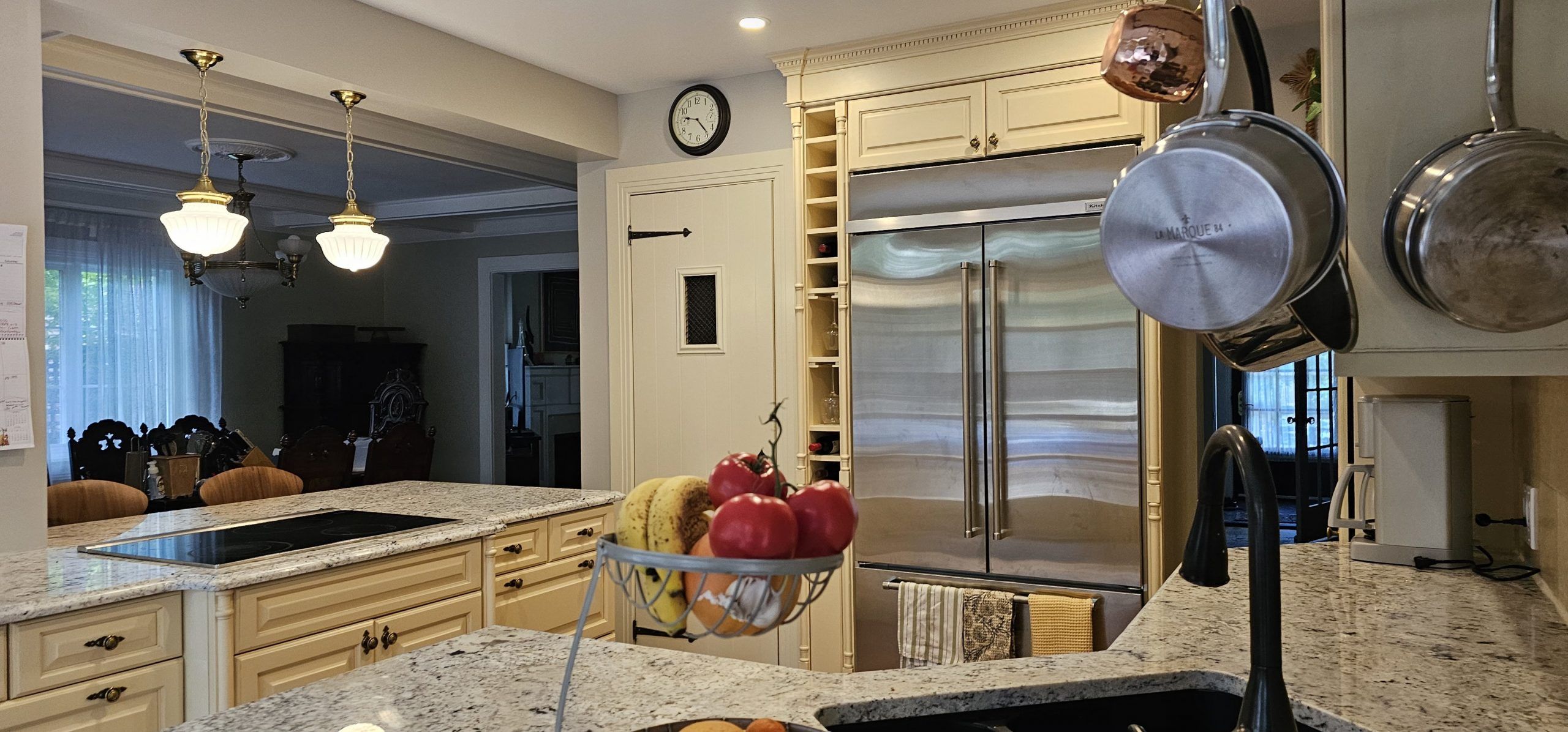 For this renovation, we transformed a closed-off kitchen and living room into an open, light-filled space by removing a load-bearing wall. One of the key challenges was skillfully preserving the client’s original lower cabinets while integrating new, custom-built cabinetry that flawlessly matched the existing design.